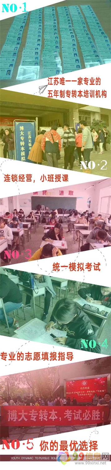 从专科变成本科,变的不仅仅是学li,更是眼界的拓展、朋友圈的改变www.99xinxi.net99信息网。当你通过自己的努力去了心仪的学校念了喜欢的专业,那种满足感是没有任何东西可以替代的。全江苏省(南京、苏州、无锡、常州、镇江、南通、扬州、盐城、泰州、淮安、徐州、宿迁、连云港)众多五年一贯制高职在校生都要把握好时机,抓住仅有的一次专转本的机会!